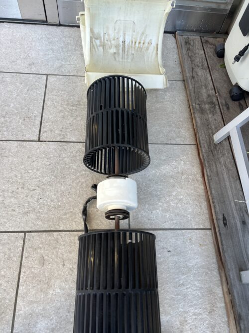 ブロワーファンには薬剤混じりの油汚れが蓄積。